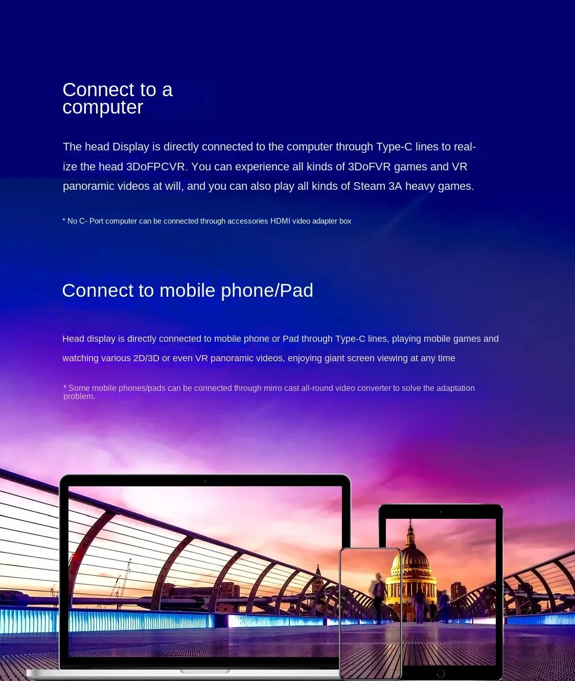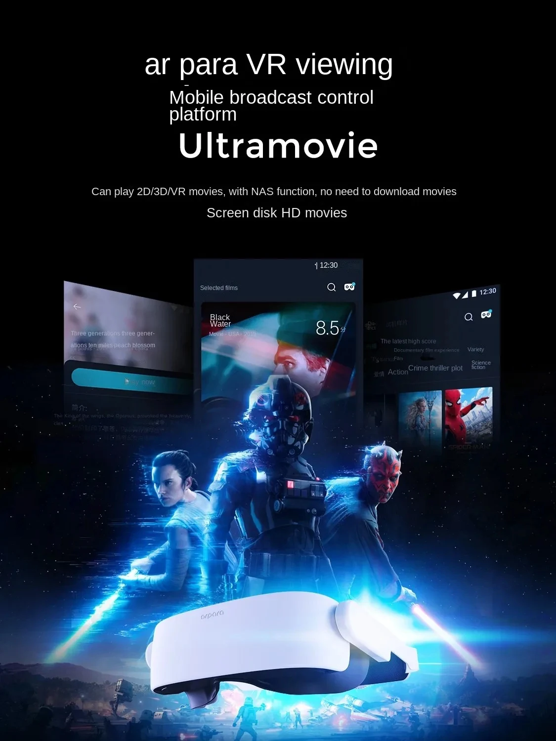 6. VR mobile viewing: The headset is directly connected to the mobile phone or Pad through the Type-C cable, and the mobile broadcast control platform arparahome can not only realize the 3DoF freedom of the head to play VR games, but also watch various 2D/3D videos, and enjoy 5K giant screen viewing at any time